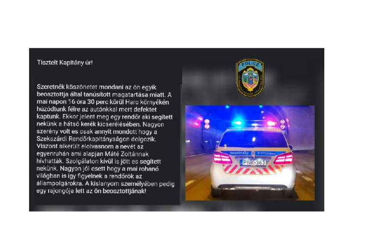A napokban egy siófoki család küldött levelet Szekszárd rendőrkapitányának, melyben megköszönték munkatársunk segítségét. A kapitányság megbízott járőralosztály vezetője, Máthé Zoltán rendőr főhadnagy 2021. január 28-án szolgálatból tartott hazafelé, amikor a 65-ös főúton Harcnál arra lett figyelmes, hogy az úttest szélén egy család bajba került , mivel az autójuk defektet kapott. Kollégánk azonnal megállt, és segített kicserélni a légvesztett kereket.