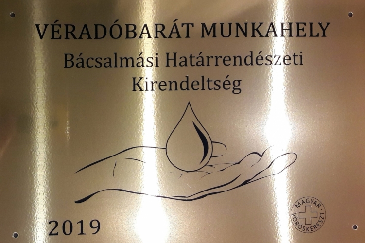 A Magyar Vöröskereszt Véradóbarát munkahely kitüntetést adományozott a Bácsalmás Határrendészeti Kirendeltség részére.