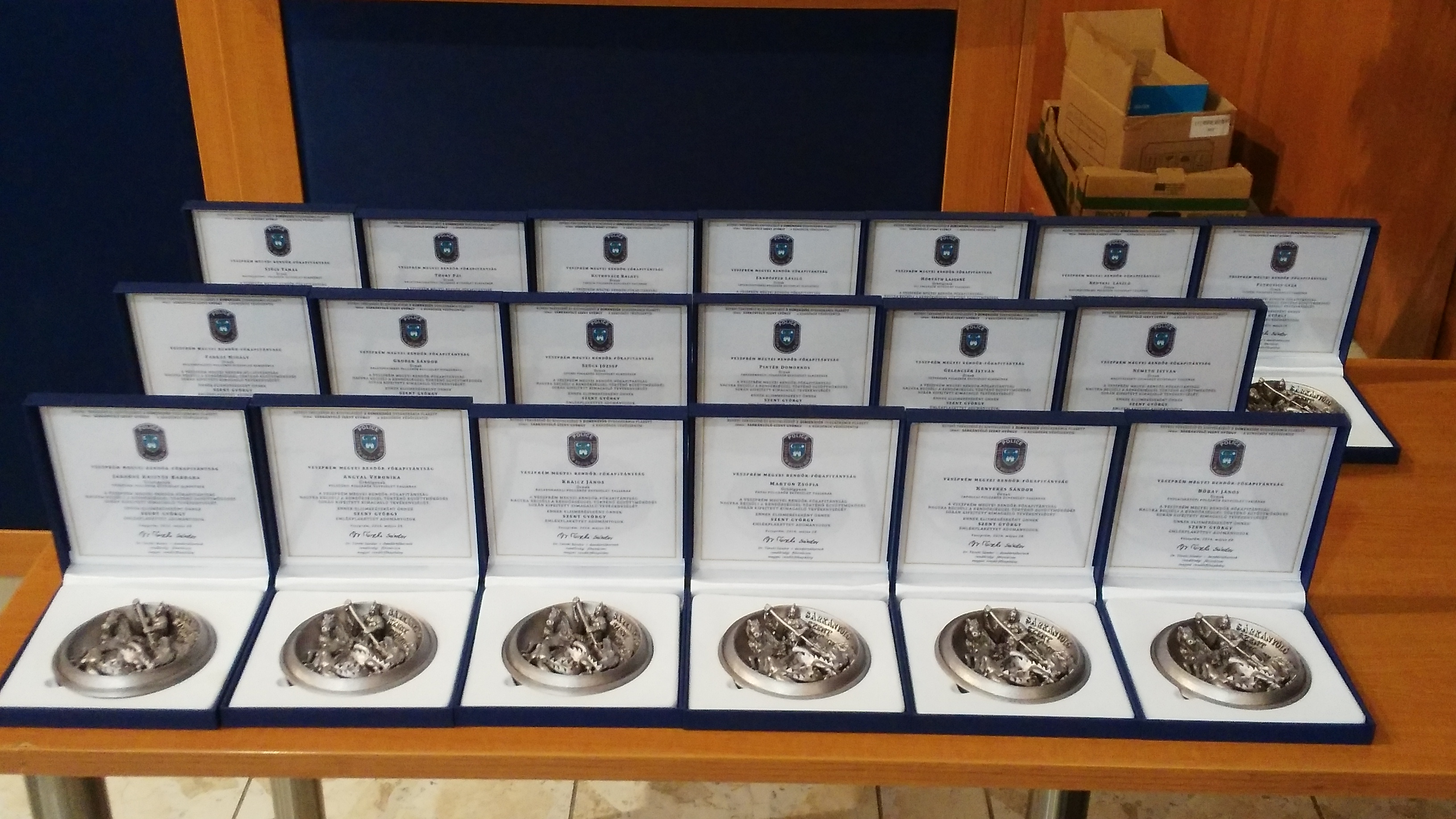 Dr. Töreki Sándor rendőr dandártábornok „Sárkányölő Szent György” emlékplakettet adott át a megyei rendőr-főkapitányság elismeréseként Jakabné Kristóf Barbara tüskevári, Farkas Mihály magyarpolányi, Szűcs Tamás nagyalásonyi, Angyal Veronika felsőőrsi, Gruber Sándor balatonalmádi, Thury Pál balatonakarattyai, Krajcz János balatonakali, Szűcs József lovasi, Kutrovácz Balázs takácsi, Marton Zsófia pápai, Pintér Domonkos ábrahámhegyi, Ernhoffer László lesenceistvándi, Kenyeres Sándor tapolcai, Gelencsér István pétfürdői, Horváth Lajosné ősi, Bobay János gyulafirátóti, Németh István nagyvázsonyi, Nedvesi László nagyesztergári valamint Petrovics Géza szápári polgárőröknek. A jutalmazottak az elmúlt évben nyújtott kiemelkedő teljesítményükkel jelentősen hozzájárultak Veszprém megye közbiztonságának fenntartásához.