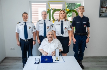 Tolna vármegye legidősebb rendőrét, Kovács Imre ny. r. alezredest 100. születésnapján köszöntette a vármegyei rendőrfőkapitány, dr. Hablicsek Nikoletta r. ezredes és a vármegye legfiatalabb rendőre, Fintor Dávid r. őrmester.