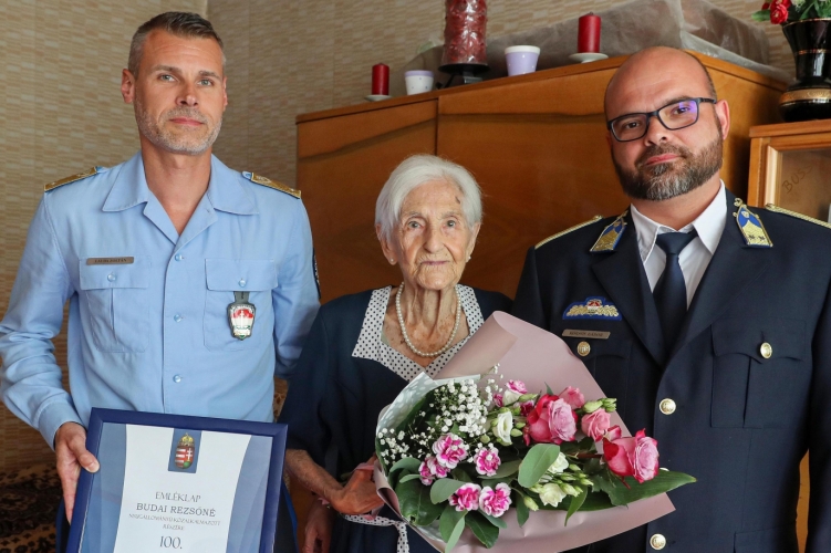 Budai Rezsőné, Éva nénit, az egykori rendőrségi irodai dolgozót 100. születésnapján köszöntötték rendőri vezetők, köztük Lauda Zoltán dandártábornok, a Pest Vármegyei Rendőr-főkapitányság vezetője.