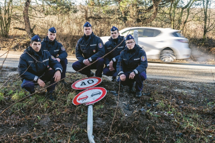 – Öt kocsival lehettünk hátrébb, amikor láttuk, mi történt. Kisoroltunk, majd a másik sávban a BMW mellett megálltunk, és megkezdtük a biztonsági intézkedést – idézte fel Laponyi Zsolt őrmester, a Rendőrségi Oktatási és Kiképző Központ (ROKK) Rendőrképző Akadémia adyligeti tanulója, aki négy diák- és szakasztársa, Dobrovitz Ádám Attila, Takács Máté, Orbán Dániel és Kovács Örs Attila társaságában tartott visszafelé a közeli szupermarketből. – Dániel és Örs megállították a forgalmat, Ádám a BMW-shez ment, aki épp a segélyhívót tárcsázta, jómagam pedig a golfoshoz siettem Mátéval. Mindkét járműben csak a vezetők tartózkodtak, és a golfos nem nézett ki jól. Rádőlt az utasülésre, de magánál volt, a mellkasát fájlalta. A kocsi motorteréből viszont erős füst gomolygott. Kiemeltük, ebben egy másik sofőr is segített, és beültettük a BMW-be. Miután Ádám levette a Golf gyújtását, puszta kézzel feszítettük fel a motorháztetejét, és egy tízes kulccsal, amit a BMW-stől kaptam, kicsavaroztam az akkumulátor érintkezőit. Erre alábbhagyott a füst. Ezek után a legközelebbi kis utcákba tereltük a forgalmat.