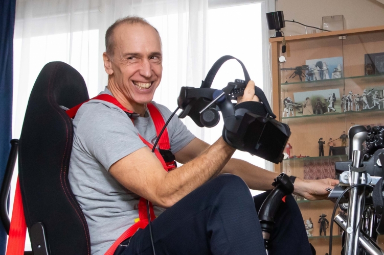 – A jelenlegi konfigurációm alapjai nagyjából 25 éve indultak, amikor ismét találkoztam a Flight Simulator 2002-es verziójával, és vettem hozzá egy gázkarral egybeszerelt botkormányt. Ezt követően először három monitort kötöttem össze, hogy kialakuljon a térhatású élmény, majd külön gázkart, pedálokat is beszereztem – eleveníti fel a ma egy jobb családi autó árát magában foglaló, térben is mozgó, VR-szemüveggel kombinált pilótaszék létrejöttét Marosvári Csaba. – A mostani rendszer az IL-2, X-Plane 11, Flight Simulator 2020 és főleg a Digital Combat Simulator programok köré épül. A pilótaszék ma már egy mozgó platformon van, hogy ne csak egy helyben üljek, míg a virtuális repülőgép forog. A szimulált repüléshez speciális eszközökre is szükség volt, így elkészítettem egy, az igényeimnek megfelelő helikoptergázkart, ForceFeedback-botkormányt vagy például az AH-64 Apache harci helikopter fegyverzetkezelő konzolját is.