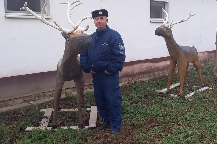 Medve István zászlós, a Battonyai Határrendészeti Kirendeltség kiemelt főhatárrendésze nagyon szeret a szabadban lenni, több mint két évtizede ugyanott szolgál. Akár egy tájkép alapján megmondja, merre kell elindulni. Így hát az ünnepekre is mi mással készülhetne, mint szabadtéri díszekkel. Kézügyességének köszönhetően maradék anyagokból kedves figurák állnak össze.