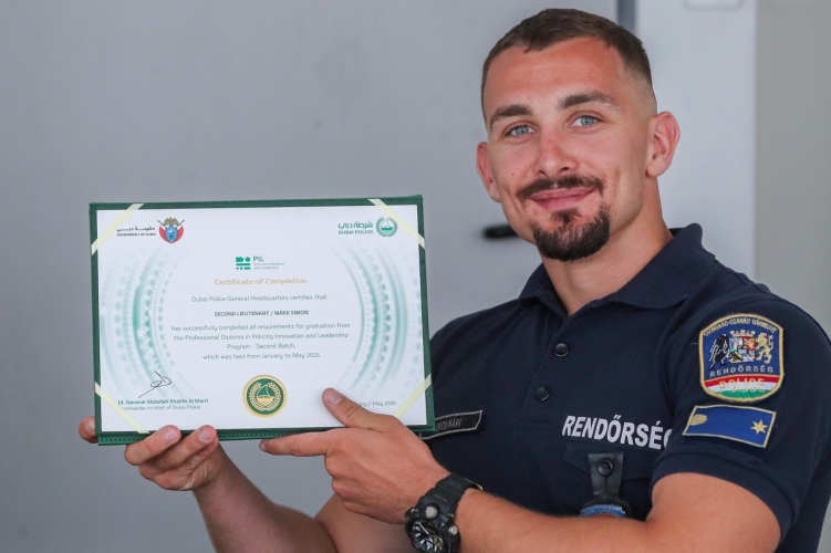 – Hajnali 2 órakor érkeztem meg a dubaji nemzetközi repülőtérre, ahonnan busz vitt minket a campusra. Olyan kollégákkal találkoztam és lehettem együtt négy hónapig, akik a világ számos kontinenséről, 38 országból érkeztek, a Karib-térségtől és Latin-Amerikától Európán és Dél-Afrikán át egészen Kínáig és Délkelet-Ázsiáig – meséli Simon Márk hadnagy, a Szegedi Rendőrkapitányság Közrendvédelmi Osztályának előadója. – A képzés négy részből állt: az RIT Egyetem adta akadémiai részből, általános vezetéselméletből, rendőri szakmai gyakorlatból, valamint wellnessből, ami a sportot jelentette. Nagyon nagy hangsúlyt fektettek az egészségfejlesztésre, főleg a sportra. Rendkívül érdekes és hasznos volt a tanfolyam, a tanárok a világ minden tájáról érkeztek, többek közt Angliából, Hollandiából, Németországból, Dél-Afrikából, az USA-ból, valamint online bejelentkeztek Ausztráliából is. A szakmai tudás mellett a gondolkodásmódot is formálták. A dubaji rendőrség olyan technológiát használ, ami a legtöbb országban még csak kísérleti szinten sem létezik. A legnagyobb különbséget a közlekedésrendészet területén láttam. Míg Magyarországon a forgalmat többnyire járőrök és fix sebességmérők ellenőrzik, Dubajban a közlekedés felügyeletét szinte teljesen átvették a mesterséges intelligenciával támogatott rendszerek. Az autópályákon mesterséges intelligenciával kiegészített kapuk, oszlopok működnek: ezek kamerákkal felszerelt rendszerek, amelyek nemcsak a sebességet mérik, de felismerik, ha valaki szabálysértést követ el, például indokolatlanul átlépi a záróvonalat vagy telefonál, esetleg nem köti be magát, áthajt a piroson. Ezt a rendszer automatikusan rögzíti, kiértékeli, és elküldi a bírságot a járműtulajdonosnak. Ezenfelül nemcsak lát, de „hall” is a kamera, egyes szakaszokon azt a járművet is kiszűri, amelyiké meghaladja az előírt zajhatárértéket. Az igazoltatás is egyszerűbben megy, mert a járőrautók elején és a hátulján lévő kamerák beolvassák az elhaladó kocsi rendszámát, ami az összes rá vonatkozó adattal megjelenik a járőr számára. Integrált arcfelismerő program is működik benne, amely alapján azonosítja a kocsiban utazókat, ezen adatokat szintén a rendőr rendelkezésére bocsátja.