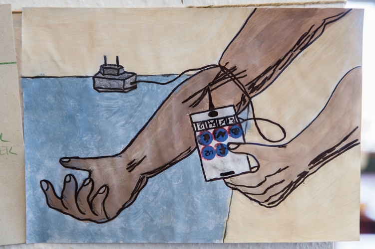 A díjak átadása után a kiállítás képeit nézegetjük a díszteremben. Az egyiken a számítógép monitorja nem más, mint egy hatalmas kígyó szája, amelyik épp elnyelni készül áldozatát. A másik alkotáson, az alsó tagozatosok győztesének pályaművén egy emberi csuklóhoz bilincselt mobiltelefon látható. A harmadikon egy guillotine, amelybe nem emberi fej, hanem egy mutatóujj van beszorítva. Mutatóujj, amely a felette lebegő veszéllyel mit sem törődve éppen egy mobiltelefont készül nyomkodni. A többi képen a számítógép monitorja körül megjelenő ijesztő alakok, sötét figurák, szövegbuborékokban az internetezés veszélyei.