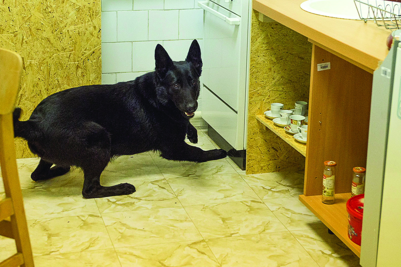 A taktikai házban az állatok ismerkednek az épített környezettel. Nem lenne jó, ha éles bevetésen megriadnának egy csúszós parkettától, nyikorgó padlótól, létrától.