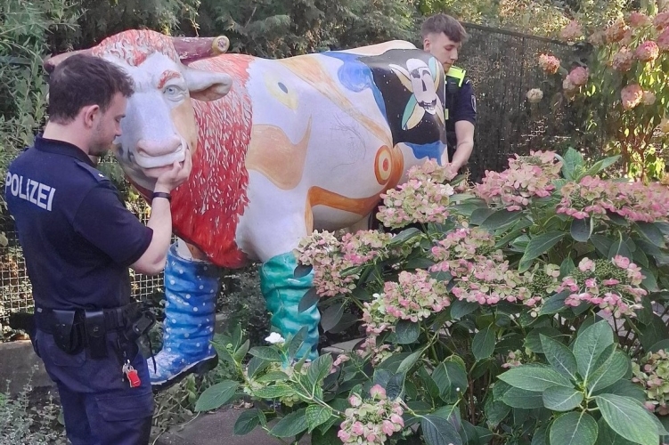 Berlini rendőrök bejelentésre reagálva mentek ki egy steglitzi lakónegyedhez, ahová ismeretlenek az éj leple alatt letettek egy műanyag szarvasmarhát. Miután kinyomozták, hogy a szürreális műalkotás honnan tűnt el, visszavitték, ami nem volt mindennapi fuvar.