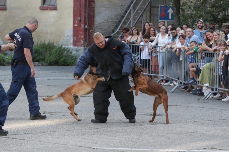 Az udvaron az érdeklődők ki- és felpróbálhatták a rendőrség tömegkezelési eszközparkját, megtekinthették a kiképzésre használt, hatástalanított fegyvereket és célba lőhettek lézerpuskával is. Nagy népszerűségnek örvendett a kutyás intézkedéstaktikai bemutató, amelyen a járőrebek többféle alkalmazását is bemutatták a közönségnek, amely tapssal jutalmazta a négylábúak helytállását.