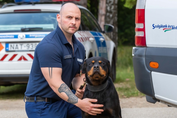 Tizenhárom éve rendőr, két és fél éve költözött Borsodból Zalaegerszegre, merthogy 450 kilométerrel odébb talált az állományon belül új munkahelyet. Rendőrként szolgált nagypapája, édesapja, de a barátai többségéből is az lett; mi más lehetett volna Takács István Tamásból, mint Takács István Tamás főtörzsőrmester, aki most éppen a Zalaegerszegi Rendőrkapitányság kutyás csoportjának járőrparancsnoka. Felmenői nemcsak rendőrök voltak, de kutyarajongók is. Sokféle kutyájuk volt, mégpedig a keményebb fajtákból. Így aztán nem csoda, hogy a két érdeklődési kör összeért: Takács István Tamásból kutyavezető járőr lett. 2016-ban kezdte az első kutyás alaptanfolyamot egy belga juhásszal. Amikor aztán Borsodban kevesebb kutyás rendőrt igényelt a szolgálat, az ő kutyáját is át kellett volna adnia másnak, öten próbálták tőle átvenni, de a belga juhász senkit sem fogadott el új gazdának. Végül – bár már nem dolgozik – változatlanul Takács István Tamással él. Aki viszont dolgozik vele, az egy rossz tartási körülmények közül kimentett eb: Rocco, a hatéves rottweiler.
