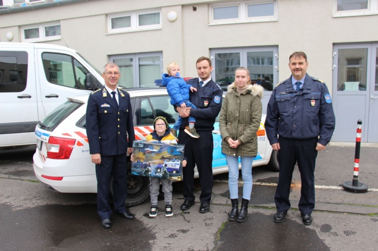 A kis jutalmazott remekül érezte magát a főkapitányságon, és hálás volt az ajándékokért, főleg a rendőrös játékért.