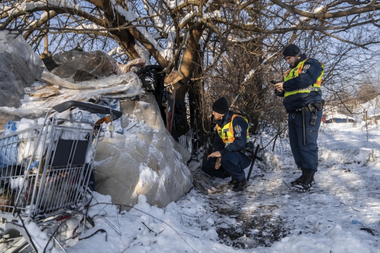 – Ez egy új menedék lehet, még nem láttuk itt – csodálkozik Németh Bence, ahogy a járőrautó egy elhagyatott parkolóba kanyarodik, ahol a bokrok alatt egy kartondobozokból, matracokból összerótt, hevenyészett téli menedéket fedez fel. A gardróbszekrény méretű kuckóban négyen élnek. – Kértük őket, hogy a hidegre való tekintettel és a saját biztonságuk érdekében menjenek be a melegedőre, ami ide csak 500 méter. Megadtuk a szálló telefonszámát is, már pakolnak. Velük szót tudtunk érteni, jólesik, hogy segíthettünk, amennyit tudtunk.