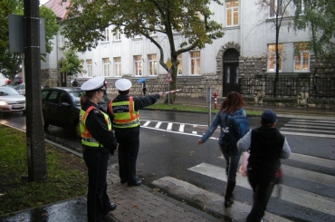 Rendőr segíti a győri iskolásokat a közlekedésben.