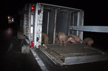 Felborult egy sertéseket szállító nyerges vontató.