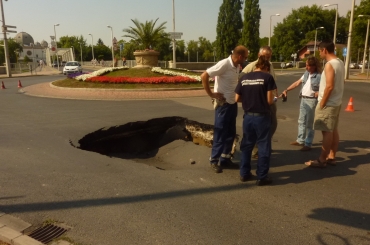 Beszakadt az út Győrben a Petőfi-híd lábánál.