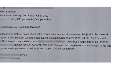 Egy 11 éves kislány szülei írtak emailt a Gárdonyi Rendőrkapitányságra, melyben köszönetüket fejezték ki a gyermeküknek nyújtott segítségért.