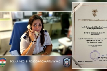 A Tolna Megyei Rendőr-főkapitányság Tevékenység-Irányítási Központjának munkatársa kimagasló szakmai tevékenységéért elismerésben részesült.