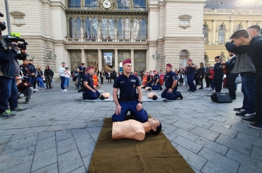 A rendőrök az Újraélesztés Világnapja alkalmából flash mobot tartottak a pályaudvar előtt.