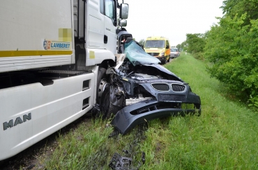 Az ütközés következtében a személyautó a kamion alá szorult .