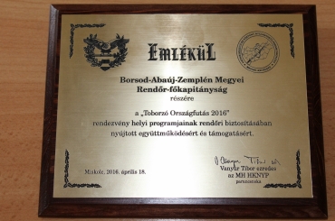 Emlékplakettet vett át a Borsod-Abaúj-Zemplén Megyei Rendőr-főkapitányság vezetője a „Toborzó Országfutás 2016” elnevezésű program miskolci etapján.