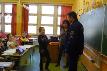 Az egyenruhás rendőr az osztály előtt köszöntötte fel születésnapja alkalmából a kisfiút és ajándékot is vitt neki.