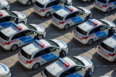 52 darab új szolgálati gépkocsi bemutatására került sor a mai napon a Budapesti Rendőr-főkapitányság Mosonyi utcai objektumának udvarán.