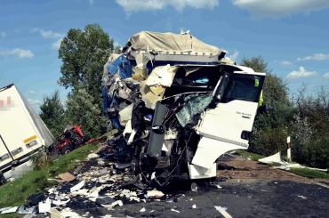 Egy autó fedélzeti kamerája felvette, ahogy két kamion frontálisan ütközött össze Kecskemét közelében.