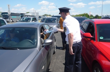 Hűtött ásványvízzel kínálják a rendőrök a Röszke Autópálya-határátkelőhelyen kilépésre várakozó utasokat, ahol szombat délelőttre négyórás várakozás alakult ki.Az átkelőhely teljes kapacitással működik annak érdekében, hogy a határátlépés minél gördülékenyebben történjen.