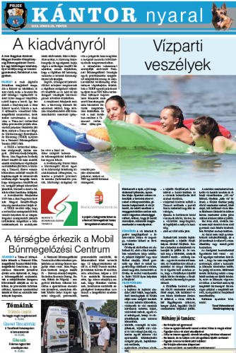 Ahogy arról korábban hírt adtunk, a Jász-Nagykun-Szolnok Megyei Rendőr-főkapitányság egy különleges kiadvánnyal szólítja meg az iskolás gyerekeket, fiatalokat. Mivel nyár van, és az iskolások is vakációznak a megelőzési szakemberek a bűnmegelőzési ajánlásokat most nem digitális formában, hanem - a megyei Új Néplap és a Nemzeti Bűnmegelőzési Tanács segítségével - a megyei újság mellékletének hasábjain juttatják el az olvasókhoz, nyaralókhoz. A Kántor nyaral című kiadvány komplex bűnmegelőzési ajánlásokat tartalmaz, kifejezetten a nyár veszélyei köré építve mondanivalóját, amelyeknek kicsik és nagyok, gyerekek és felnőttek, vakációzók, fürdőzők és dolgozók egyaránt hasznát vehetik. Szó esik a fürdőzés szabályairól, a trükkös tolvajokról és módszereikről, hogy mit tehetünk vagyontárgyaink védelme érdekében és arról is, hogy milyen bűnmegelőzési rendezvények lesznek a Tisza-tónál. Az ide látogatók találkozhatnak a Nemzeti Bűnmegelőzési Tanács Mobil Bűnmegelőzési Centrumával, és például a Tiszafüredi Halas Napokon az Üzenet táncszínház különleges produkciójával.