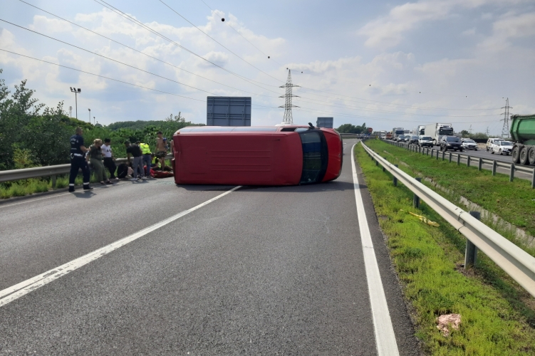 Az M0 autóút M3 autópálya felé vezető oldalán borult fel egy kisbusz 2023. augusztus 17-én délután.