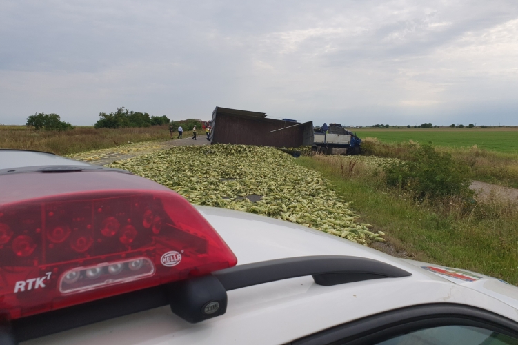 Két személygépkocsi és egy kukoricát szállító, pótkocsis tehergépkocsi ütközött Törökszentmiklósnál.