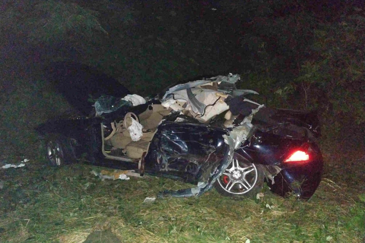A Mercedes az ütközést követően egy fának csapódva állt meg. Abban hárman utaztak, mindegyikük megsérült.