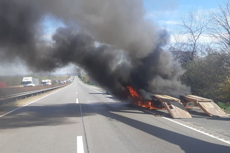 A Komárom-Esztergom Megyei Rendőr-főkapitányság tájékoztatja a járművezetőket, hogy április 14-én 14 óra 40 perc körül egy műszaki hibás félpótkocsi gyulladt ki az M1-es autópályán. Bicske térségében, a műszaki sávban áll a szerelvény. A tűzoltók a munkálatokat megkezdték, a rendőrök a pálya forgalmát az oltási időre lezárták. A forgalom majd a belső sávon indulhat meg. Torlódásra és lassú haladásra kell számítani.