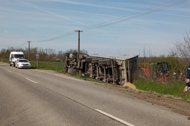 Egy búzát szállító teherautó borult árokba Simontornya és Tolnanémedi között.