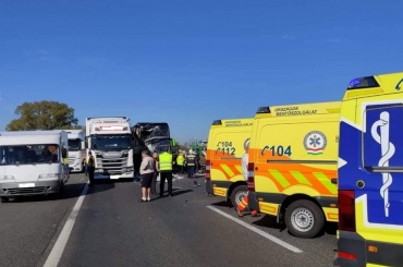 A Budapest felé vezető oldal 75-ös kilométerszelvényében egy járműszerelvény és egy autóbusz ütközött.