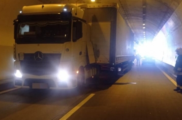 Az autópálya Pécs felé vezető oldalán egy műszaki hibás jármű vesztegel az alagútban.