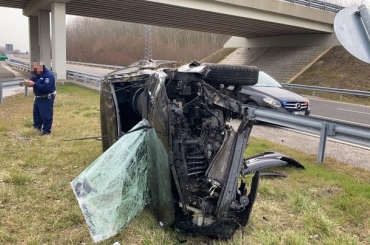 Egy autó oldalára borult a Bogyiszlói lehajtónál.