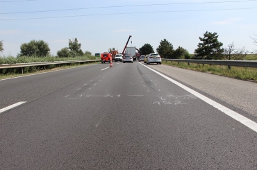 Három tehergépjármű ütközött össze a Budapest felé vezető oldal 33. kilométerszelvényében.