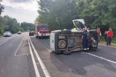 Egy mikrobusz az oldalára borult.