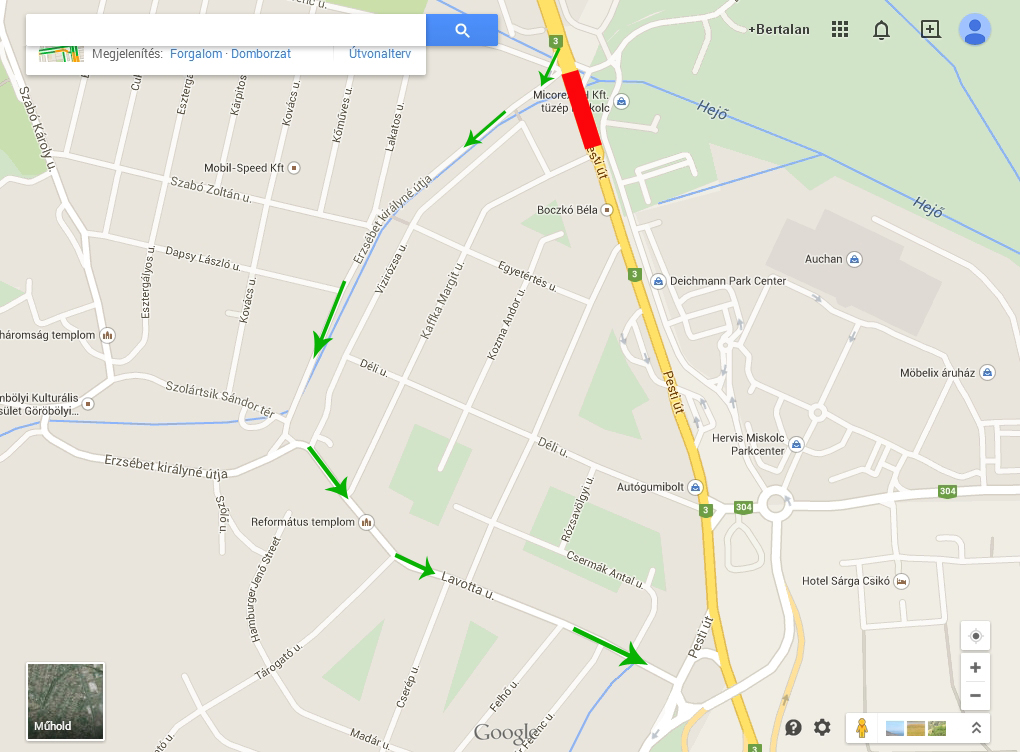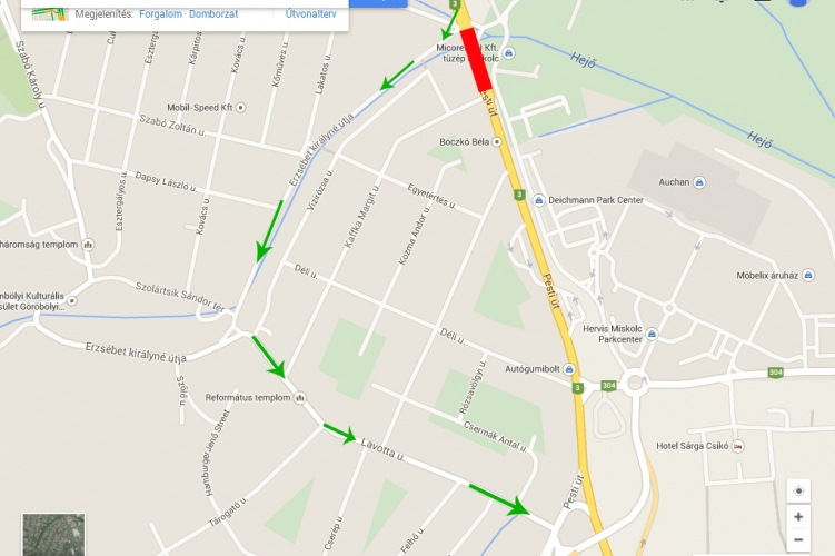 - A 3. számú főközlekedési út Miskolcra bevezető szakaszán az Auchan áruház előtt lévő körgeometriájú csomópontból forduljanak rá az M30-as főútra. A közlekedők az M30 főút Miskolc-déli lehajtójánál a 304-es útra letérve, majd jobbra kanyarodva a Praktiker Áruház előtti szervizúton áthaladva a Bogáncs úton keresztül jutnak vissza a Pesti útra a demonstrációval már nem érintett területre.