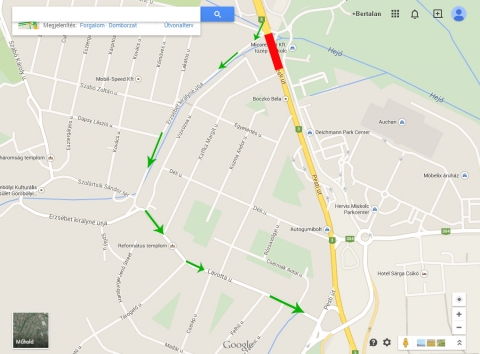 A 3. sz. főúton a Budapest felé haladók a Pesti út- Erzsébet királyné kereszteződésénél jobbra forduljanak az Erzsébet királyné útjára, onnan tovább a Lavotta útra, majd balra a Harsányi út érintésével vissza a Pesti útra.