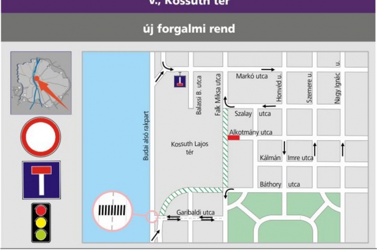 A forgalmirend-változásra a környező utcák jelzőtáblái is figyelmeztetnek. A Garibaldi utca a Nádor utca és a Széchenyi rakpart között kétirányú lesz, a déli oldali rakparti rámpa úgyszintén, viszont az északi rámpa megszűnik, így az alsó rakpartról északi irányból a felső rakpart a Lánchídnál érhető el. A Pesti alsó rakparton a Garibaldi utcánál egy új jelzőlámpás gyalogátkelőhely létesül. A térre a Falk Miksa utca – Szalay utca találkozásától nem lehet behajtani. A Balassi Bálint utca zsákutca lesz a térnél a Markó utca felől. A Markó utcai rámpát az alsó rakpartról dél felől érkezők használhatják csak, mert felfelé egyirányú lesz. A téren és környékén még folynak az utómunkák.