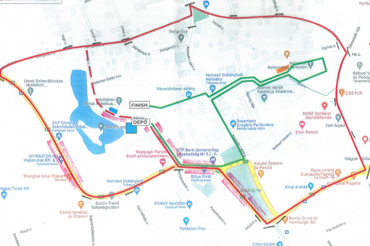 Papok rétje – Zrínyi u. – Szabadság tér – Szentvér u. – Édesanyák u. – Madách u. – Kossuth u. – Damjanich u. – Bajcsy Zs. u. – Zrínyi u.