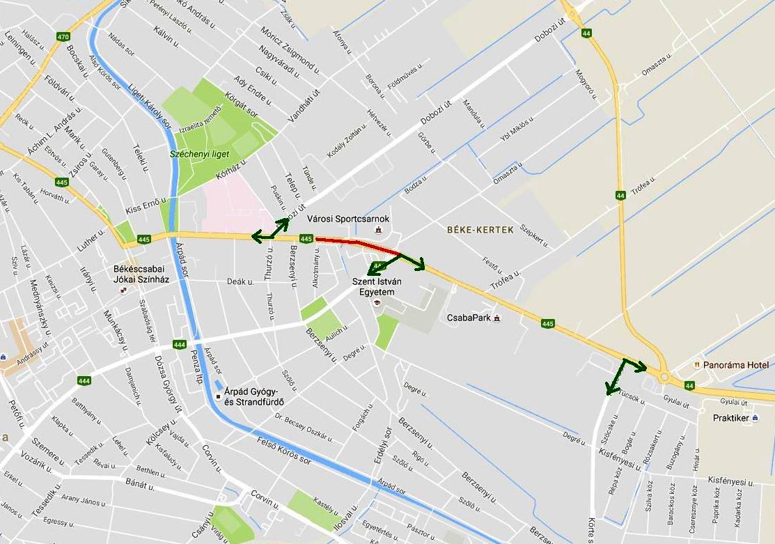 A Magyar Közút Nonprofit Zrt. Békés Megyei Igazgatósága 2016. október 26-án 9 óra 30 perckor rendezvény miatt lezárta a Gyulai út Alkotmány utca és Bajza utca közötti szakaszát. A korlátozás 2016. november 2-án 8 óráig lesz érvényben. A Gyula felől érkezők Békéscsaba belvárosát a Bajza utcán közelíthetik meg. A Gyula felől személygépkocsival érkezők a Körte sor – Lencsési út – Corvin utca útvonalon is el tudják kerülni a lezárt útszakaszt. A Gyulai úton Békéscsaba belvárosa felől (a Kossuth tér irányából) érkezőket a Dobozi útra terelik.