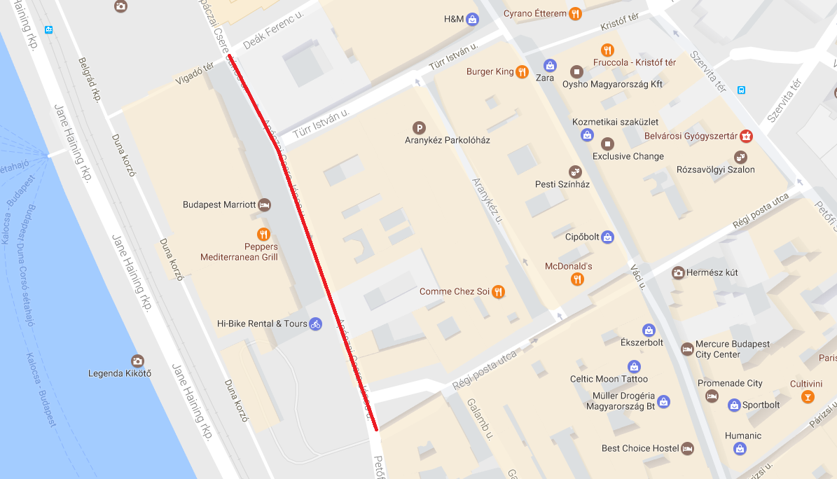 Apáczai Csere János utca páros oldalán a Vigadó tér és a Régiposta utca között.