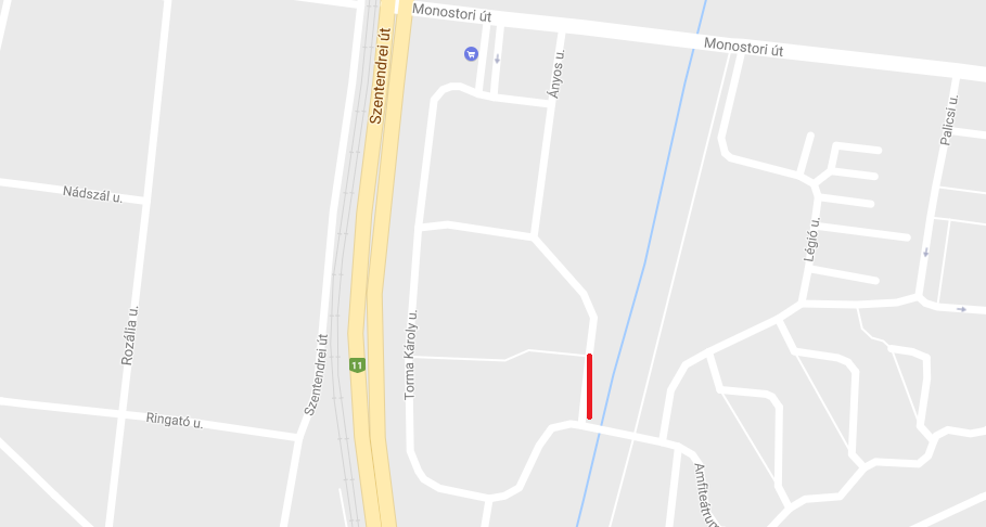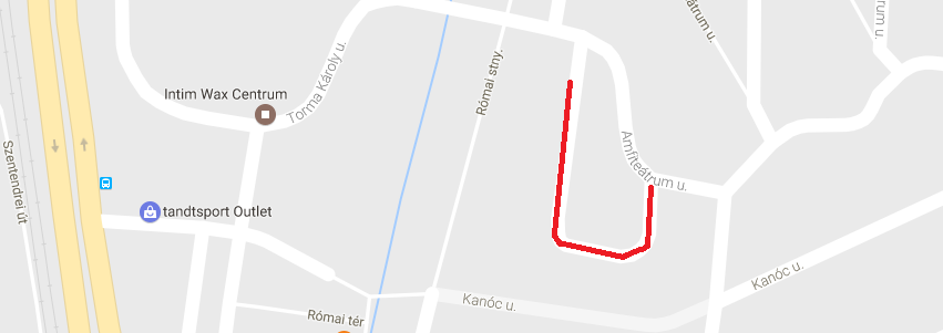 Amfiteátrum utca páratlan oldalán az 1. és a 19. szám között, valamint az 1-19. számú épületek előtti szervízút mindkét oldalán.