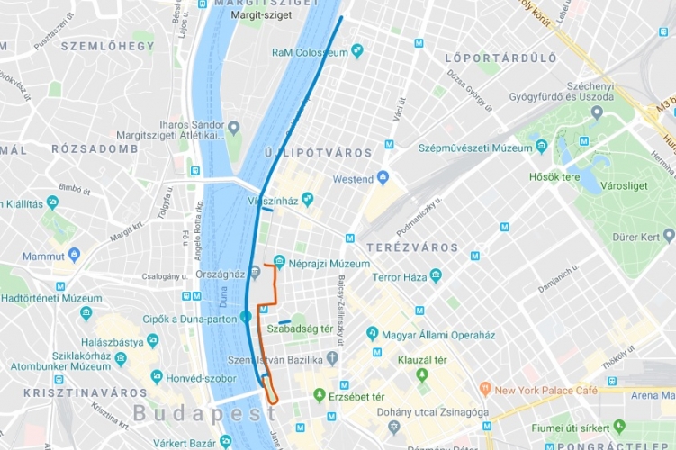 - Pesti alsó rakparton a Lánchíd északi parkolója és a Dráva utcai felhajtó között, az épületek felőli oldalon,