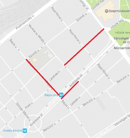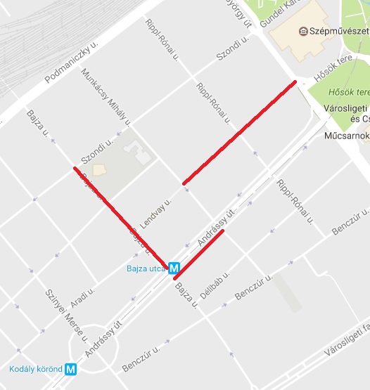 Andrássy út páros oldali szervízútján a Bajza utca és a Munkácsy Mihály utca között,