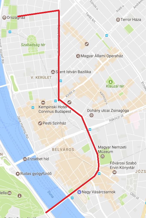 Szent Gellért tér – Szabadság híd – Vámház körút – Múzeum körút – Károly körút – Bajcsy-Zsilinszky út – Alkotmány utca – Kossuth tér útvonal