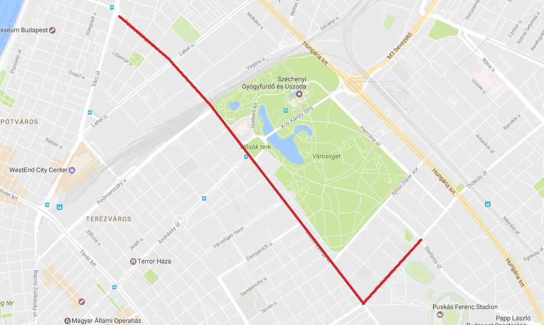 Dózsa György út – Hősök tere – Thököly út – Stefánia út útvonalat.